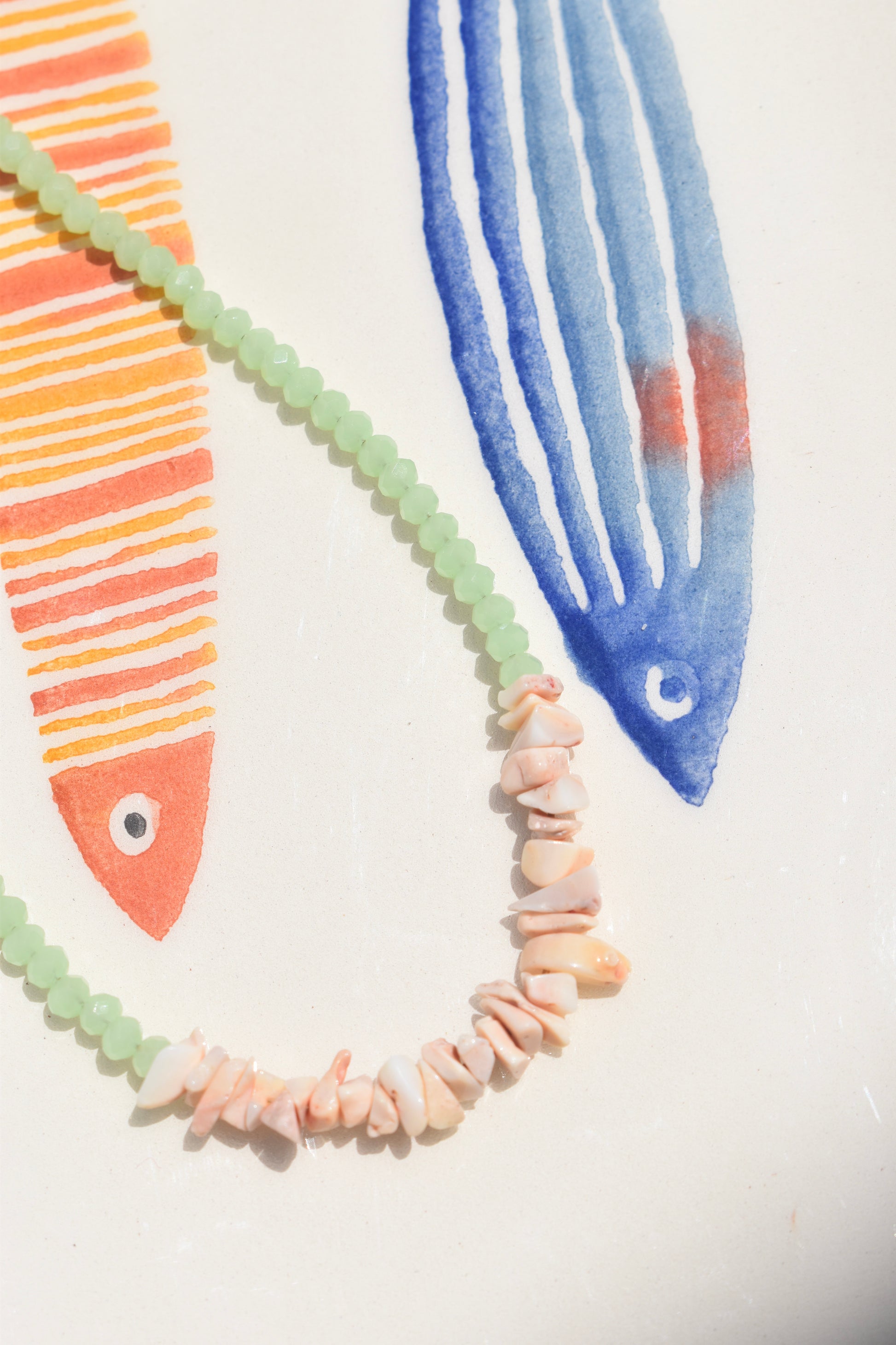 Capture Europe’s sun-kissed coastlines. Faceted glass green beads shimmer like the Mediterranean sea, while natural shell beads add an organic, beachside charm. Together, they create a harmonious blend of vibrant color & texture.